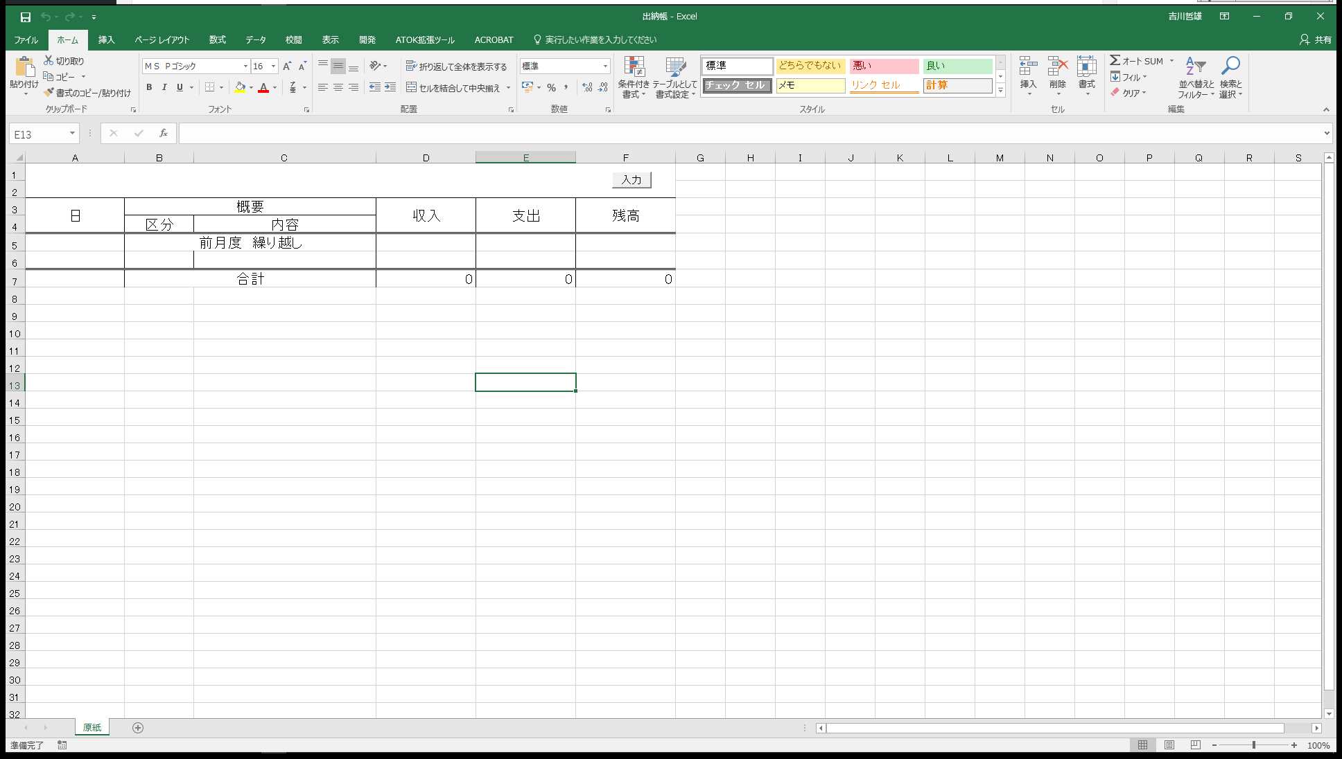 2)前月の最終残高を自動的に先頭セルにリンクさせる。(=’前月シート名’!残高のセルアドレスで入力するもの)
